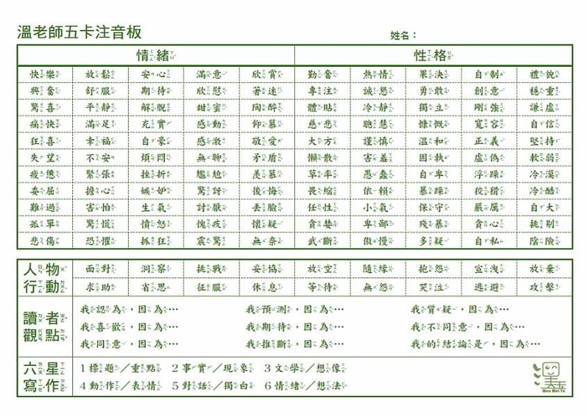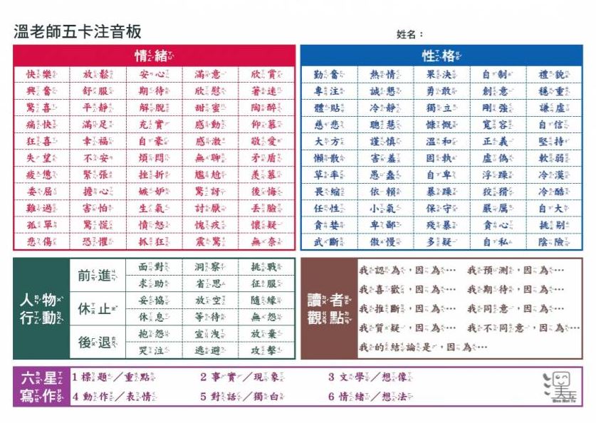 全開溫老師五卡板-彩色(注音)