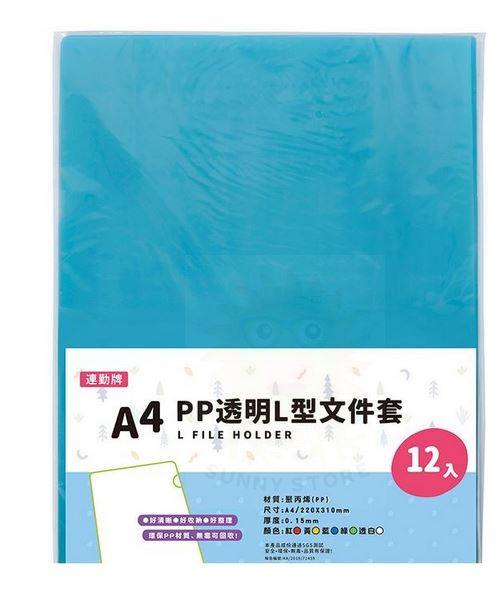 連勤 E310-Y A4 PP L型文件套/L夾12入-藍色0.15mm