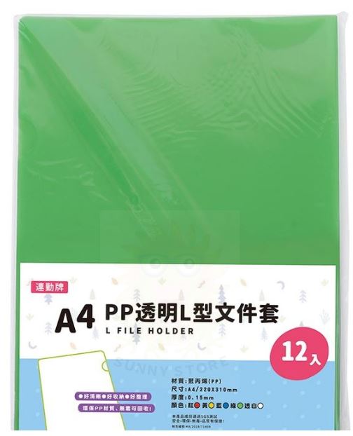 連勤 E310-G A4 PP L型文件套/L夾12入-綠色0.15mm